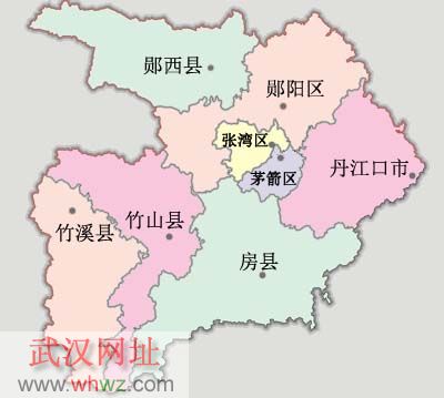 十堰市轄張灣區、茅箭區、鄖陽區及丹江口市、鄖西縣、竹山縣、竹溪縣、房縣,下設13個街道辦事處、72個鎮、34 個鄉、1842個村委會、159個居委會。